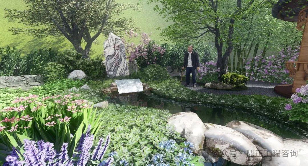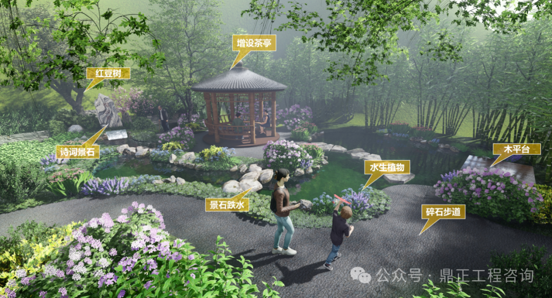 水景观水文化打造:通过深挖相公泉历史文化内涵,进行本地印象提炼。“相公”一词在古代,是妻子对丈夫的称呼,也是君子、生员(秀才、相公)、宰相的另一种叫法。君子爱茶,沏茶品茗,修炼品性,以茶可雅志,茶是象征着尘世的纯洁。设计从自然山水出发,落位于闲情逸致设计基调,泉眼处采用题字景石配上一棵姿态旖旎的红豆,视线端头一幅竹影锦鲤、花木跌水的画面映入眼帘,两侧的树木林立,开合有致,整个节点的中心是一座圆顶茶亭,在亭中,一壶清茶问道,仿佛拉近了古今往事,也增加了场地的记忆,呈现出 “千年古树频招手,万年清泉溢清香”的意境。