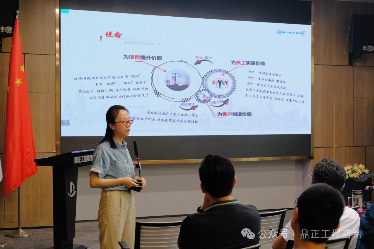 会议伊始,毛迎霞总经理宣贯了《以价值创造者为本的鼎正文化体系》,紧扣“价值创造”这一核心要义,全面解读了企业文化升级后的使命、愿景、价值观及人才观。