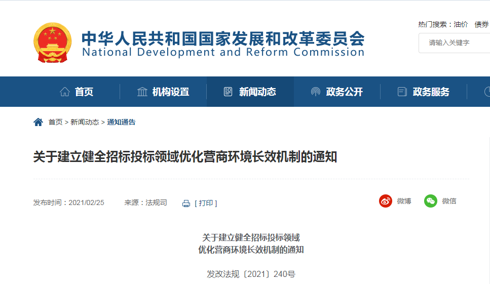 关于建立健全招标投标领域优化营商环境长效机制的通知