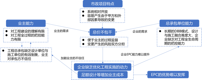 简言之,市政项目的特点、业主和总承包单位的能力导致了市政工程项目是总价不包干的,而这使得总承包单位缺乏优化设计施工融合的动力,甚至使得总承包单位进行设计与施工的畸形融合。而这一方面使得业主对推行工程总承包兴趣缺失甚至存在抵触,对总承包单位的管理能力建设迟缓,另一方面也使得总承包单位的工程总承包能力建设推进缓慢,而这又进一步固化了总价不包干的模式,从而使得工程总承包的优势难以发挥,由此,工程总承包推进艰难。